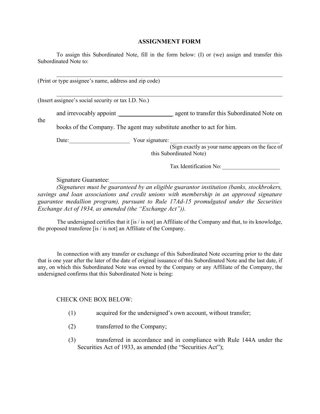 ASSIGNMENT FORM To assign this Subordinated Note, fill in the form below: (I) or (we) assign and transfer this Subordinated Note to: (Print or type assignee’s name, address and zip code) (Insert assignee’s social security or tax I.D. No.) and irrevocably appoint _________________ agent to transfer this Subordinated Note on the books of the Company. The agent may substitute another to act for him. Date: _____________________ Your signature: ______________________________________ (Sign exactly as your name appears on the face of this Subordinated Note) Tax Identification No: ____________________ Signature Guarantee: ______________________________________________________ (Signatures must be guaranteed by an eligible guarantor institution (banks, stockbrokers, savings and loan associations and credit unions with membership in an approved signature guarantee medallion program), pursuant to Rule 17Ad-15 promulgated under the Securities Exchange Act of 1934, as amended (the “Exchange Act”)). The undersigned certifies that it [is / is not] an Affiliate of the Company and that, to its knowledge, the proposed transferee [is / is not] an Affiliate of the Company. In connection with any transfer or exchange of this Subordinated Note occurring prior to the date that is one year after the later of the date of original issuance of this Subordinated Note and the last date, if any, on which this Subordinated Note was owned by the Company or any Affiliate of the Company, the undersigned confirms that this Subordinated Note is being: CHECK ONE BOX BELOW: (1) acquired for the undersigned’s own account, without transfer; (2) transferred to the Company; (3) transferred in accordance and in compliance with Rule 144A under the Securities Act of 1933, as amended (the “Securities Act”);