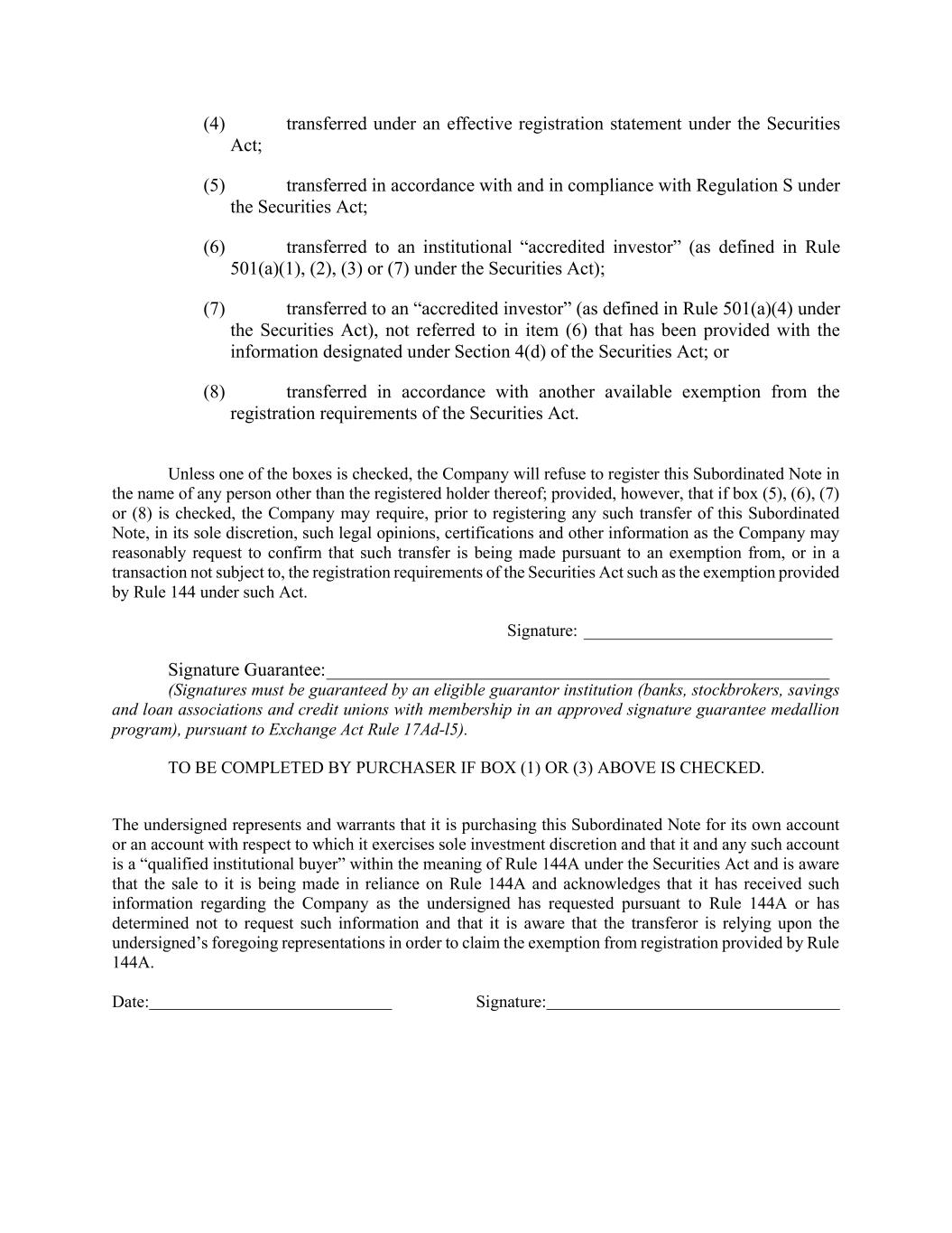 (4) transferred under an effective registration statement under the Securities Act; (5) transferred in accordance with and in compliance with Regulation S under the Securities Act; (6) transferred to an institutional “accredited investor” (as defined in Rule 501(a)(1), (2), (3) or (7) under the Securities Act); (7) transferred to an “accredited investor” (as defined in Rule 501(a)(4) under the Securities Act), not referred to in item (6) that has been provided with the information designated under Section 4(d) of the Securities Act; or (8) transferred in accordance with another available exemption from the registration requirements of the Securities Act. Unless one of the boxes is checked, the Company will refuse to register this Subordinated Note in the name of any person other than the registered holder thereof; provided, however, that if box (5), (6), (7) or (8) is checked, the Company may require, prior to registering any such transfer of this Subordinated Note, in its sole discretion, such legal opinions, certifications and other information as the Company may reasonably request to confirm that such transfer is being made pursuant to an exemption from, or in a transaction not subject to, the registration requirements of the Securities Act such as the exemption provided by Rule 144 under such Act. Signature: _____________________________ Signature Guarantee: ______________________________________________________ (Signatures must be guaranteed by an eligible guarantor institution (banks, stockbrokers, savings and loan associations and credit unions with membership in an approved signature guarantee medallion program), pursuant to Exchange Act Rule 17Ad-l5). TO BE COMPLETED BY PURCHASER IF BOX (1) OR (3) ABOVE IS CHECKED. The undersigned represents and warrants that it is purchasing this Subordinated Note for its own account or an account with respect to which it exercises sole investment discretion and that it and any such account is a “qualified institutional buyer” within the meaning of Rule 144A under the Securities Act and is aware that the sale to it is being made in reliance on Rule 144A and acknowledges that it has received such information regarding the Company as the undersigned has requested pursuant to Rule 144A or has determined not to request such information and that it is aware that the transferor is relying upon the undersigned’s foregoing representations in order to claim the exemption from registration provided by Rule 144A. Date: Signature: