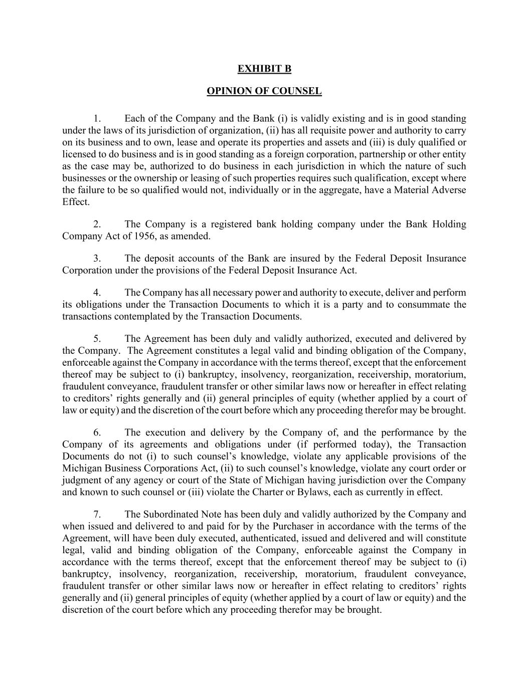 EXHIBIT B OPINION OF COUNSEL 1. Each of the Company and the Bank (i) is validly existing and is in good standing under the laws of its jurisdiction of organization, (ii) has all requisite power and authority to carry on its business and to own, lease and operate its properties and assets and (iii) is duly qualified or licensed to do business and is in good standing as a foreign corporation, partnership or other entity as the case may be, authorized to do business in each jurisdiction in which the nature of such businesses or the ownership or leasing of such properties requires such qualification, except where the failure to be so qualified would not, individually or in the aggregate, have a Material Adverse Effect. 2. The Company is a registered bank holding company under the Bank Holding Company Act of 1956, as amended. 3. The deposit accounts of the Bank are insured by the Federal Deposit Insurance Corporation under the provisions of the Federal Deposit Insurance Act. 4. The Company has all necessary power and authority to execute, deliver and perform its obligations under the Transaction Documents to which it is a party and to consummate the transactions contemplated by the Transaction Documents. 5. The Agreement has been duly and validly authorized, executed and delivered by the Company. The Agreement constitutes a legal valid and binding obligation of the Company, enforceable against the Company in accordance with the terms thereof, except that the enforcement thereof may be subject to (i) bankruptcy, insolvency, reorganization, receivership, moratorium, fraudulent conveyance, fraudulent transfer or other similar laws now or hereafter in effect relating to creditors’ rights generally and (ii) general principles of equity (whether applied by a court of law or equity) and the discretion of the court before which any proceeding therefor may be brought. 6. The execution and delivery by the Company of, and the performance by the Company of its agreements and obligations under (if performed today), the Transaction Documents do not (i) to such counsel’s knowledge, violate any applicable provisions of the Michigan Business Corporations Act, (ii) to such counsel’s knowledge, violate any court order or judgment of any agency or court of the State of Michigan having jurisdiction over the Company and known to such counsel or (iii) violate the Charter or Bylaws, each as currently in effect. 7. The Subordinated Note has been duly and validly authorized by the Company and when issued and delivered to and paid for by the Purchaser in accordance with the terms of the Agreement, will have been duly executed, authenticated, issued and delivered and will constitute legal, valid and binding obligation of the Company, enforceable against the Company in accordance with the terms thereof, except that the enforcement thereof may be subject to (i) bankruptcy, insolvency, reorganization, receivership, moratorium, fraudulent conveyance, fraudulent transfer or other similar laws now or hereafter in effect relating to creditors’ rights generally and (ii) general principles of equity (whether applied by a court of law or equity) and the discretion of the court before which any proceeding therefor may be brought.